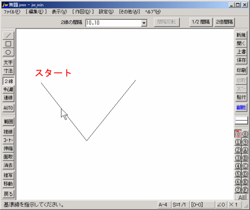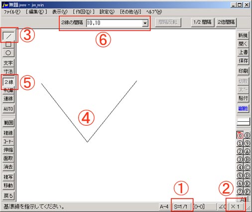 (2)Jw_cadの「2線」コマンドの設定をしましょう。 ?教材とJwの両画面の調整後、Jw下端の縮尺が「S=1/1」であることを確認してください。(1/1でないときは、縮尺ボタンを左クリックし、分母に「1」を入力後、「OK」を左クリック。) ?下端右の画面倍率ボタンを左クリックし、現れたダアログの「倍率=1.0」を左クリックすることで、画面倍率を「×1」にしてください。 ?作図ツールバーの「/」を左クリックしてください。 ?下図のように V を作図してください。(第1回「直線を引こう。」を参照) ?作図ツールバーの「2線」を左クリックしてください。 ?コントロールバーの2線間隔に「10」又は「10,10」を入力してください。 |