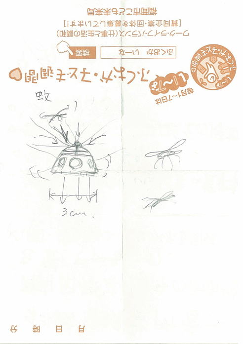 ≪アイディアの出し方≫ ●まず、今、自分や周りの人たちが日常生活で困っていることを、いろいろと思い浮かべてください。 ●次に、それらをUFOで解決できないか、想像してみてください。 ●最後に、その解決策を、落書きしながら、まとめてみてください。 ≪注≫ ・想像したUFOの大きさは自由です。(直径1CMでも、100MでもOK) ・2030年ぐらいの未来を想定し、ロボット技術(RT)・情報技術(IT)・ナノ技術(NT)・バイオ技術(BT)などの先端科学技術の進歩を先取りして結構です。 ≪例≫ ○最近困っていること。真夜中、蚊が耳のそばに「ブーン」と寄ってくる。殺虫剤を使うと息苦しくなるし、深夜電灯点けて、蚊と戦うのも嫌だ。 ○蚊を退治してくれる超小型UFOがあればいいな。メモっとこう! (左図参照) ○大きさは直径3cm、日頃は小型充電器(直径5cm)上で待機し、超高感度赤外線センサーで、蚊を発見したら浮上し、蚊を退治する。 (下図参照) |