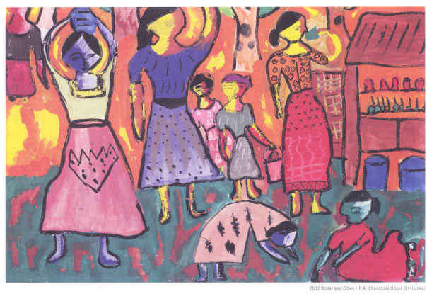 上の絵画は、P.A CHanchala さんの作品(2003年絵画コンクール)で、テーマは"ぼくたち、わたしたちの「まち」と「水」"でした。それでは、P.A CHanchala さんは、どこの国の方でしょう?下から選んでください。