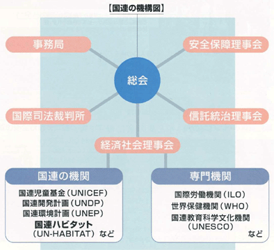 <解説> 国際連合(国連)は1945年創設から半世紀を経て、国連の担い手は「国家」から「市民」へとシフトし、「国家の安全保障」から「人間の安全保障」への思想のもとに、最近では、環境破壊・貧困・居住・伝染病・麻薬・国際犯罪などの問題解決に取り組む「経済社会理事会」の役割が大きくなってきました。その中で国際連合人間居住計画(国連ハビタットの正式名称)は、「経済社会理事会」の国連機関の一つとして、1978年、世界の人たちが安心して快適に暮らせる「まちづくり」を推進するために創設されました。