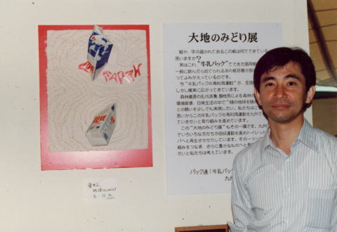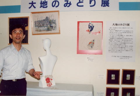 | パック連(牛乳パックの再利用を考える)九州ネットワーク主催の「大地のみどり展」に2作品を出展する。 マネキンのヒップに赤手形の作品は、当時、日仏学館でフランス語を習っていたときのフランス語の先生、オリビエ氏のもの |