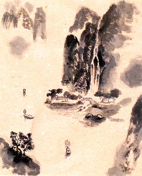 もう一つの作品、再生紙の水墨画です。 この作品に対して、フランス人のオリビエ氏は「中国の技法を使ったもので、新しいところがない。」と、まったく関心を示さなかったのですが、上の作品については絶賛してくれました。 |
