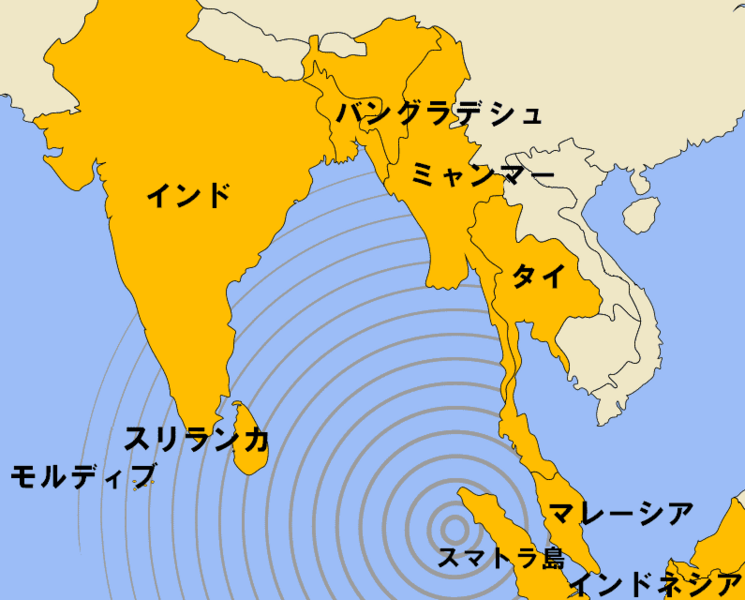 | 出典:フリー百科事典『ウィキペディア(Wikipedia)』 インド・オーストラリアプレートとユーラシアプレートがぶつかり合うスンダ海溝(ジャワ海溝)は世界有数の地震多発地帯で、100年〜150年の周期で地震が繰り返されてきている。 地震波は秒速約4km=14400km/h(およそマッハ11)で地球を少なくとも5周したとみられる。 |