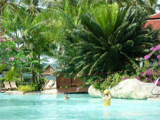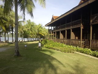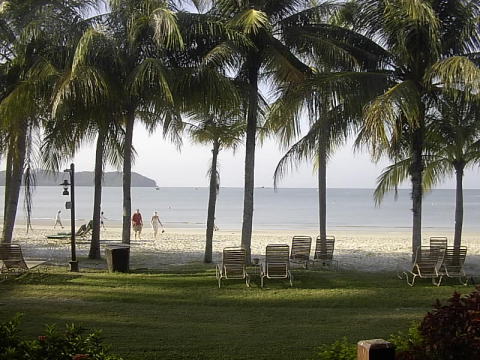 | 2004年12月25日 私、妻、長男、長女の家族4人、タクシーで福岡空港へ向かう。高速道路において、事故による渋滞に会う。 何とか集合時刻9時30分に間に合ったが、旅行代理店より、フライトが1時間遅れと聞かされる。 結局、予定より1時間以上の遅れでクワラルンプールに到着する。 やっとたどり着いた国内線のカウンターで職員から「明朝、ここへ来い。ランカウイ島への飛行機はもうない。」と告げられる。「遅れたのは、そちらの責任だ。」と抗議すると、電動自動車が現れ、飛び立つ寸前の最終便搭乗口まで運んでくれた。 深夜、ホテル(ペランギ・ビーチリゾート・スパ)に着く。 |