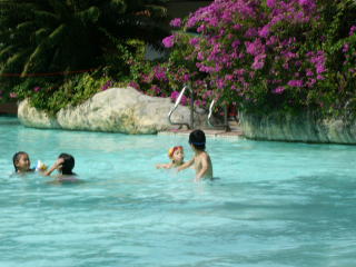 | 朝食後、子供と海の浅瀬で遊ぶ。 小魚たちが砂浜近くで、陸に向かって数列に整列しているのを発見する。 後で気がついたことだが、小魚は地震で発生した電磁波を極力避けるために、電磁波に対して垂直な姿勢をとっていたと推察される。 海からプール?へ移動 |