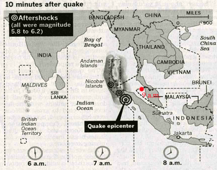 | 午前8:58(マレーシア時間)に右図のような大きな地震(マグニチュード9.1〜9.3兵庫県南部地震の約4,000倍)が発生し、津波(高さ平均10m、スマトラ島北部で最大34m)がこちらに向かっていた。出典:TIME | ![]() |