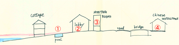 | 乳濁色の泡がプールを一瞬にして覆い尽くした。 「エバキュエート(避難しろ)」と叫び声が聞こえる。 みんなと同じ方向(ホテル・ロビー?)へ避難する。 ホテル従業員がモンスーンの大雨が原因と客に説明している姿を見る。 ホテル側からロビーも危険との説明があり、エントランス横の建物2階テラス?へ避難する。 |