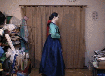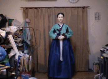 ![]() 右のCGアニメーションは、購入したチャングムの衣装とお辞儀の動作をパソコンで編集したものです。このシミュレーションを参考にして、自然な動きになるようロボットの仕組みを考えています。 |