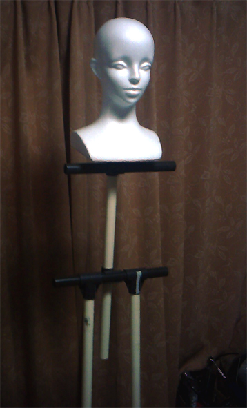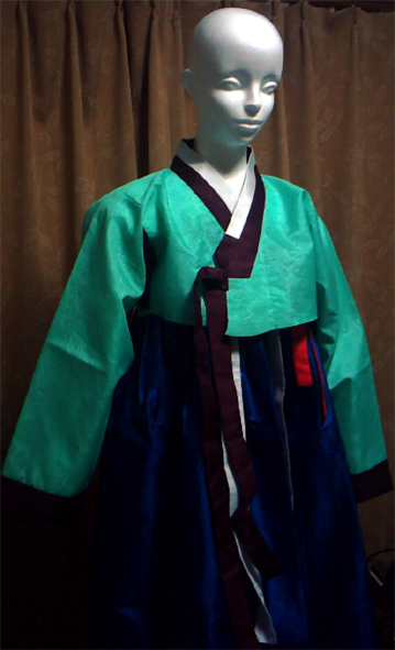 チャングム・ロボットの仮骨組に衣装を着せ、等身大(およそ165cm)の大きさを確認する。