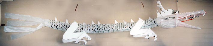 ドラゴン・モビール(動く彫刻) 見物人が操作(リモート・コントロール)する2つのモーターのオン・オフで動く。全長約6M 顎に仕掛けた上下に開閉するギアで口や舌を動かし、首に仕掛けたプロペラの送風で胴をくねらせる。 当初は、音に反応して動く仕掛けであったが、 一週間の展示であったため、乾電池容量の問題から リモート・コントロールに切り替え臨んだ。(福岡市庁舎15階にて)