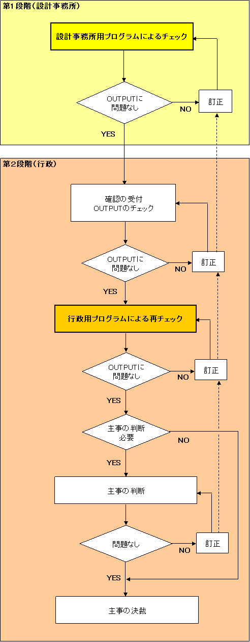 | 客観的判断が可能な建築確認業務はすべてコンピュータで行い、コンピュータが判断できない部分を人間である建築主事が確認します。また、コンピュータの使用は2段階に分け、1段階目は設計者自身で、2段階目は行政側が利用するというシステムです。具体的には、まず、安価なPC(パーソナル・コンピュータ)で処理できる設計事務所用及び行政用チェックプログラムを開発します。1段階目として、設計事務所は、設計図書等をPCに入力し、設計事務所用チェックプログラムにより建築基準法に適合しているかどうかをチェックします。OKならば行政への申請が可能になります。一方、2段階目として、行政側は、申請された設計事務所用チェックプログラムのチェック結果に目を通します。問題なければ行政用チェックプログラム(入力手間を省くためにポイントのチェックに主眼を置いた行政用の特別なプログラム)により再チェックをします。行政用チェックプログラムで判断ができない事項に関しては主事の確認を待つことになります。以下がそのフローチャートです。 |
