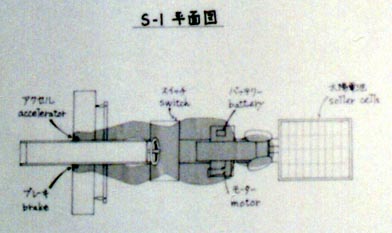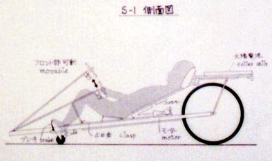 都会の空気を美しくしたい。それで、ソーラーカー(厳密にはソーラー電気自動車)を試作しました。ホンダのドリーム号(今年1993年、オーストラリア・ソーラーカーレース優勝車)と同様の前輪2つ、後輪1つの3輪方式を採用しました。車体は空気抵抗が少なくなるよう高さを極力抑えました。また、軽量化をはかるために木製にし、強度が要求される接合部には、鉄を使用しました。 この車は、胴体部、前輪部、後輪部、前方部分、後方部分の5つの部分に分解でき、運搬が容易にできます。この車には、自転車のリサイクル部品及び既製品(ソーラーパネルやモーター等)が使用されているので、この車自体もリサイクルが可能になっています。