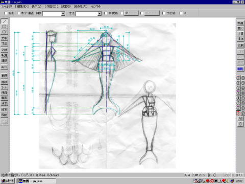 (1)設計図の作成 不要になった紙の裏等に思いついた凧の絵を描きます。 ある程度、凧の骨組み等がまとまってくれば終了。 それを、スキャナーでパソコンに取り込みます。 JW-CAD(フリーソフト)を使って形状を入力します。 入力できたら、主要な部位に寸法線を入れます。 (CADの縮尺を調整の上、寸法線の起点と終点を指定すれば、自動的に寸法が現れます。) 左図は、JW-CADで絵(正面図、側面図、構造図、ウロコ)を取り込み、寸法線等を入れているところのパソコン画面です。 |