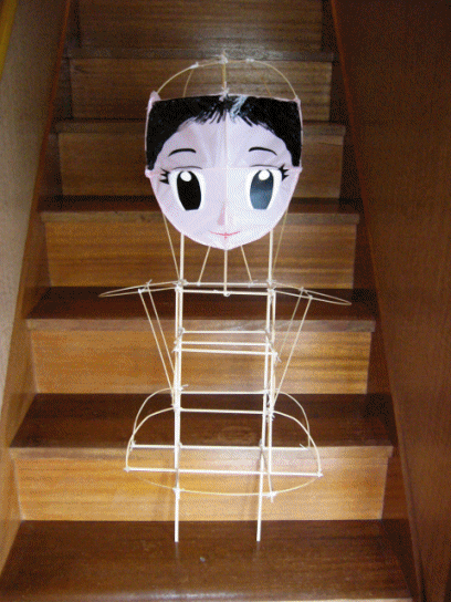 (3)骨組みの製作 設計図に合わせて、なるべく軽い材料を選定し加工します。 左の写真は、人魚の胴体部分に顔を取り付けた状態です。 頭は、風の抵抗が少なくなるように風通しの良い形状にしています。 (4)ビニール貼り 凧の主翼は、人魚の髪の部分ですので、左右対称に正確になるよう細心の注意を払いながら透明のビニールを貼り付けます。次に、白いビニールを胴体に貼り、最後に設計図に合わせて裁断した尾びれの白いビニール(筒状に加工し、表面には銀色に輝くホログラム紙をうろこ状に貼り付けたもの)と腕になるピンクの筒状ビニールを取り付けます。 (5)完成 下の写真は、完成した凧の写真です。 身長は、およそ2mです。 |