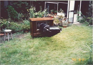 <1995年作> 旧式デザインのテレビが、「まだ、頑張れるのに」と主張している様を、テレビの中に忍ばせた首振り扇風機に黒いゴミ袋から出来た風船を連結させ表現した。扇風機の首振りに合わせて動く風船の先にはピンポン玉で作った一対の涙を浮かべた目がある。動画は1枚の写真から制作したコンピュータ・グラフィックス(CG)である。