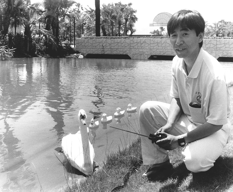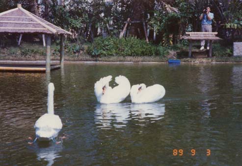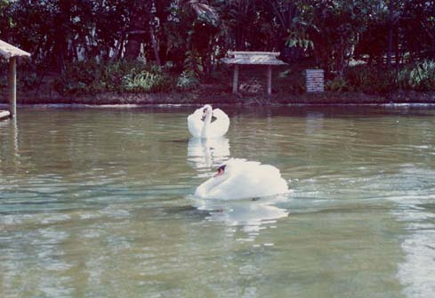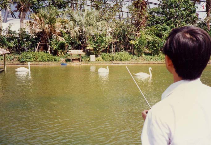 | ロボット白鳥と本物白鳥夫婦の出会い アジア太平洋博覧会(よかトピア)の思い出:アジア太平洋ゾーンの運河より 1989年6月 (西日本新聞掲載) |